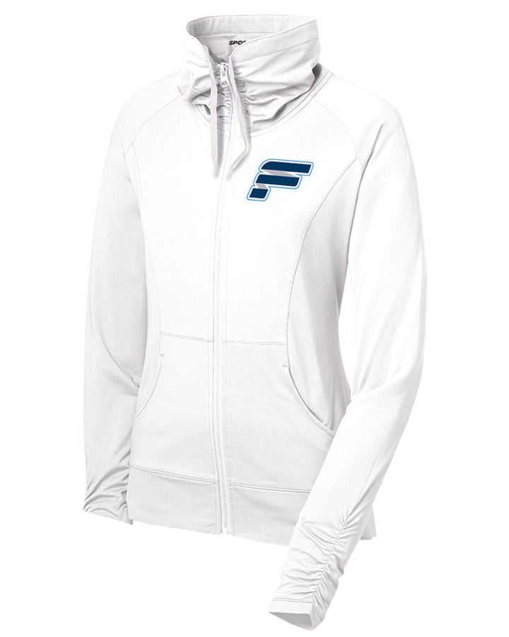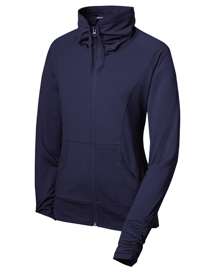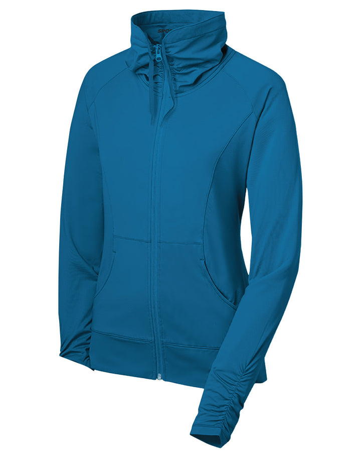 Constructed from a poly spandex blend, it provides stretch and durability with a smooth, comfortable feel. The zip through cowl collar with ruching adds a unique, elevated look while offering added coverage. Raglan sleeves allow for full range of motion, while front pouch pockets provide everyday convenience. Ruching at the cuffs enhances fit and style, and the self fabric hem ensures a clean, comfortable finish.
